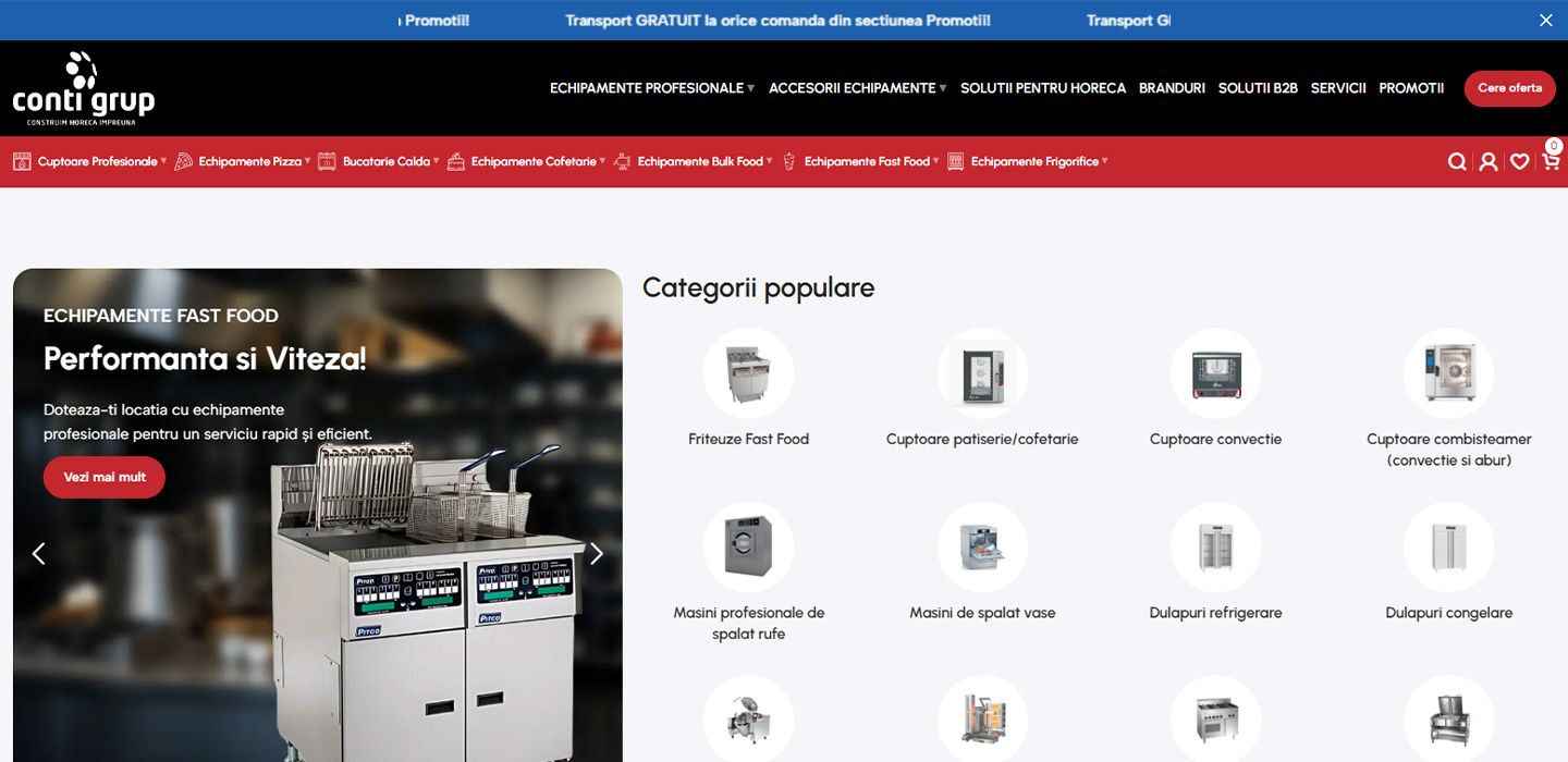 Vizitatorii site-ului sunt invitaţi să consulte catalogul online de produse, să solicite consultanţă pentru configurarea lineară a bucătăriei profesionale sau să contacteze echipa Conti Grup pentru ofertă personalizată, instalaţie şi service complete – pentru a-şi echipa afacerea horeca cu utilaje potrivite şi fiabile.