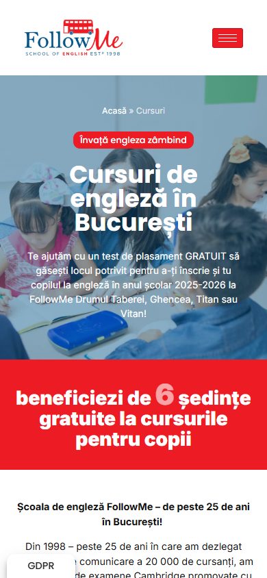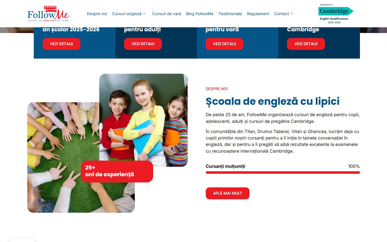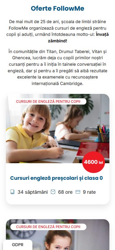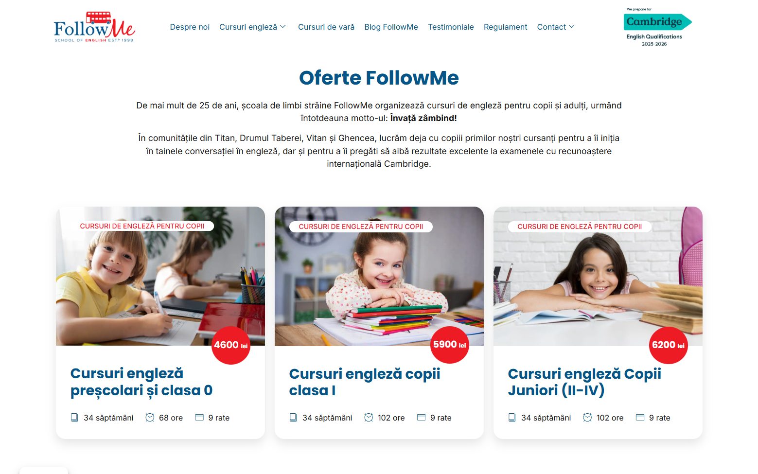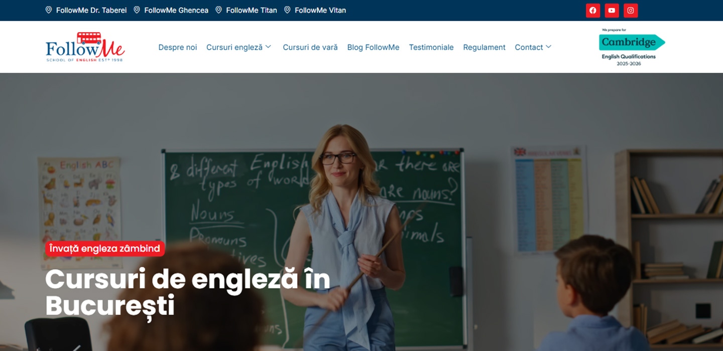 FollowMe oferă cursuri de limba engleză pentru copii, adolescenţi şi adulţi în Bucureşti — patru sedii situate în zonele Titan, Vitan, Drumul Taberei şi Ghencea, cu peste 25 de ani de experienţă în predare şi pregătire pentru examenele Cambridge English Exams.
