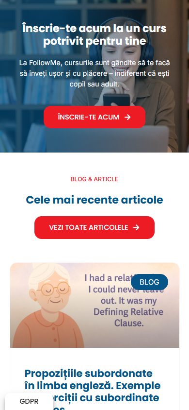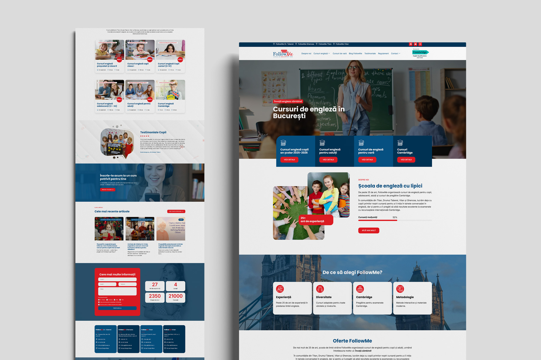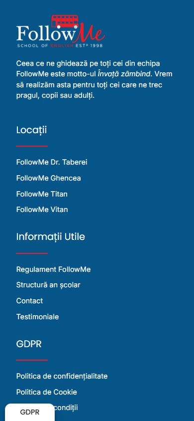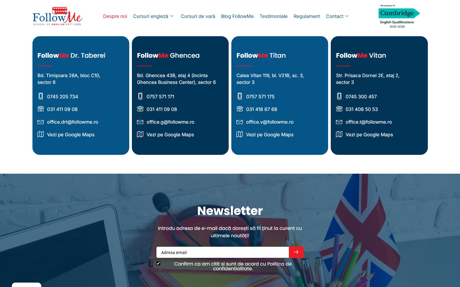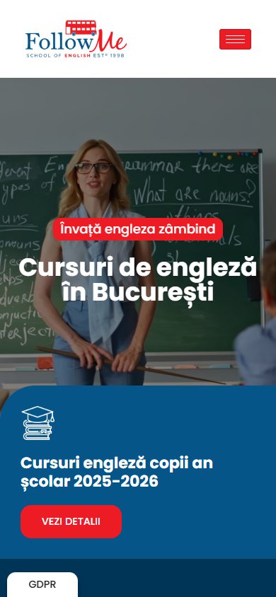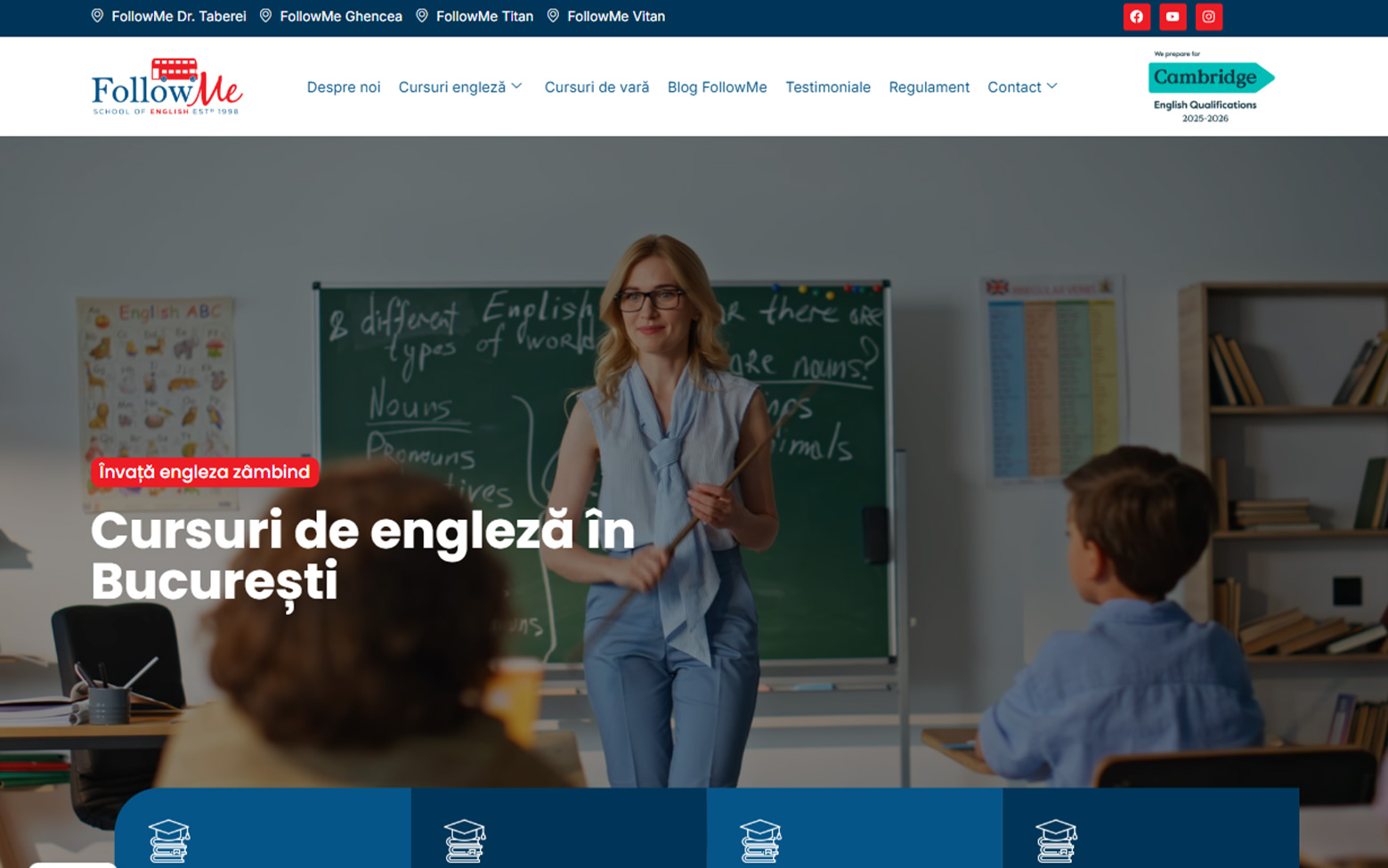 FollowMe oferă cursuri de limba engleză pentru copii, adolescenţi şi adulţi în Bucureşti — patru sedii situate în zonele Titan, Vitan, Drumul Taberei şi Ghencea, cu peste 25 de ani de experienţă în predare şi pregătire pentru examenele Cambridge English Exams.