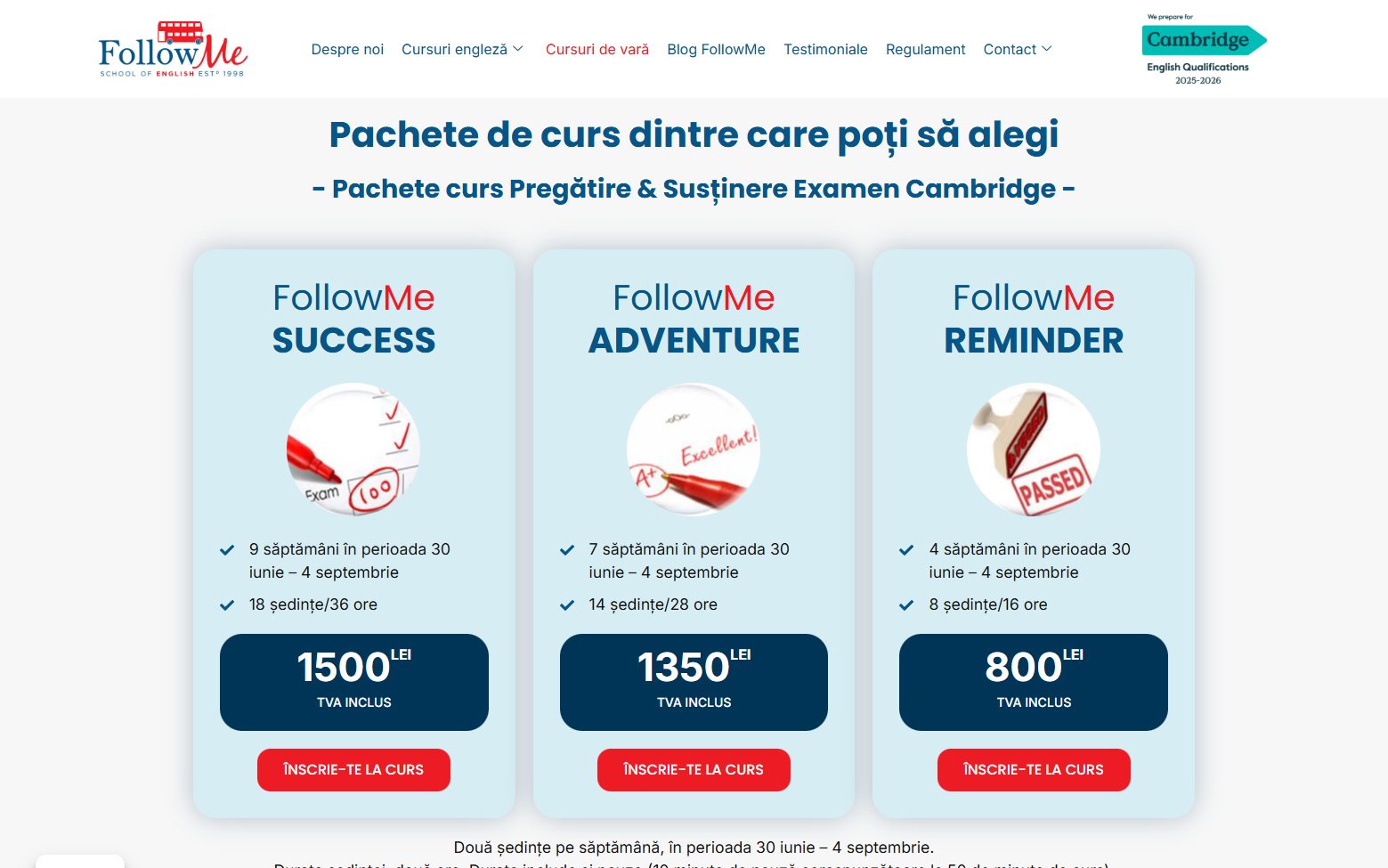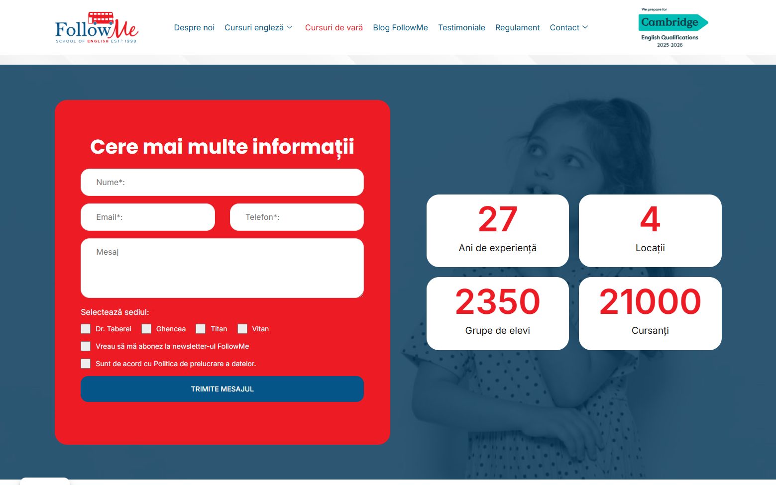 Vizitatorii site-ului sunt invitaţi să descopere oferta completă de cursuri (copii, adolescenţi, adulţi, examene Cambridge), să verifice sediile disponibile, să solicite test de plasament gratuit şi să înscrie-grupă adaptată nivelului lor.