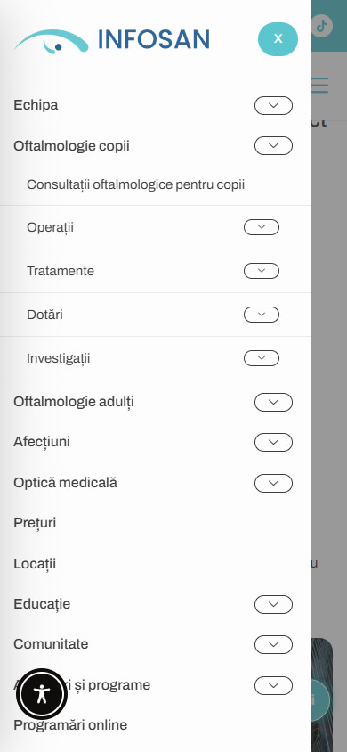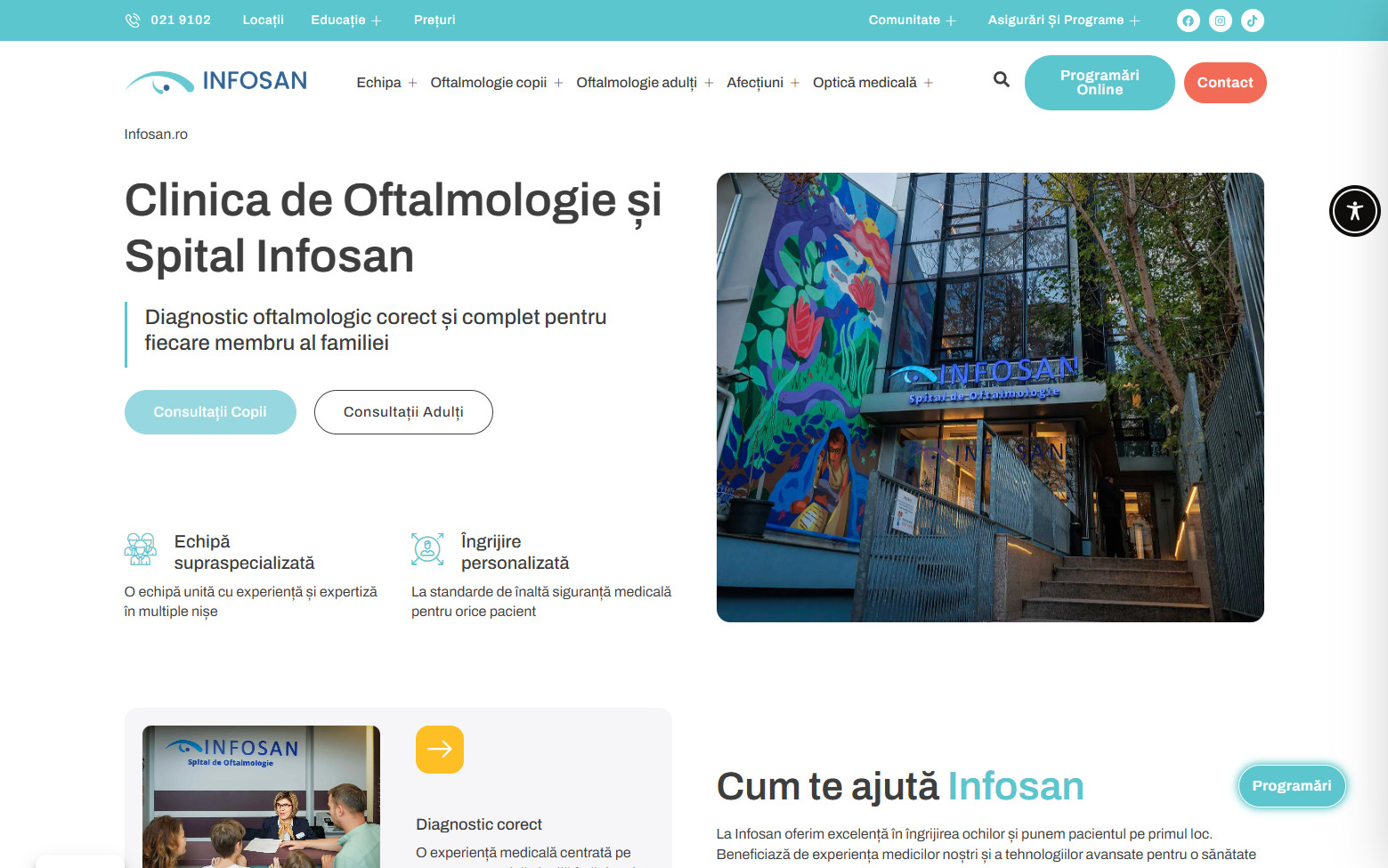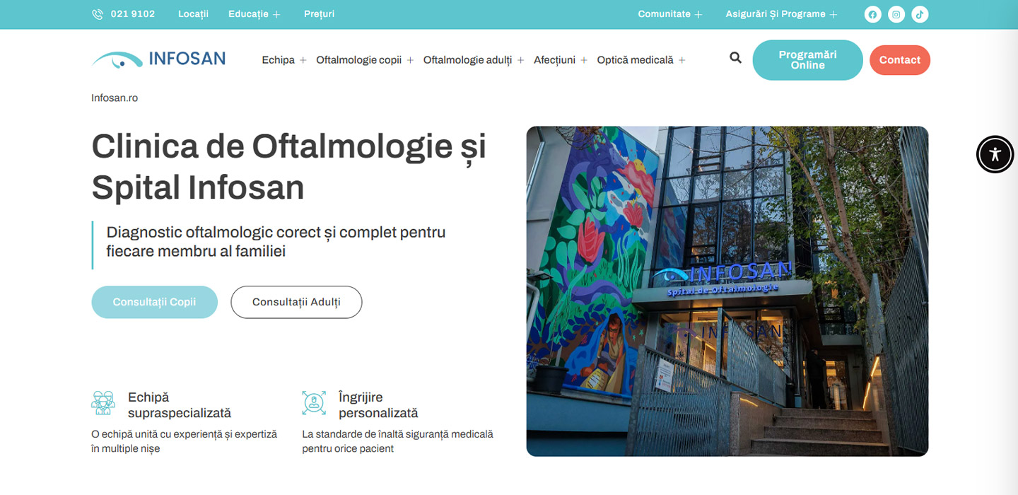 Infosan este o clinică şi spital de oftalmologie cu sediul în Bucureşti care oferă o gamă completă de servicii pentru sănătatea vizuală – consultaţii pentru adulţi şi copii, investigaţii detaliate, intervenţii chirurgicale oftalmologice şi optică medicală. Pentru fiecare pacient este disponibilă o echipă supraspecializată, dotări moderne şi un flux integrat ce acoperă de la diagnostic până la tratament şi recuperare.