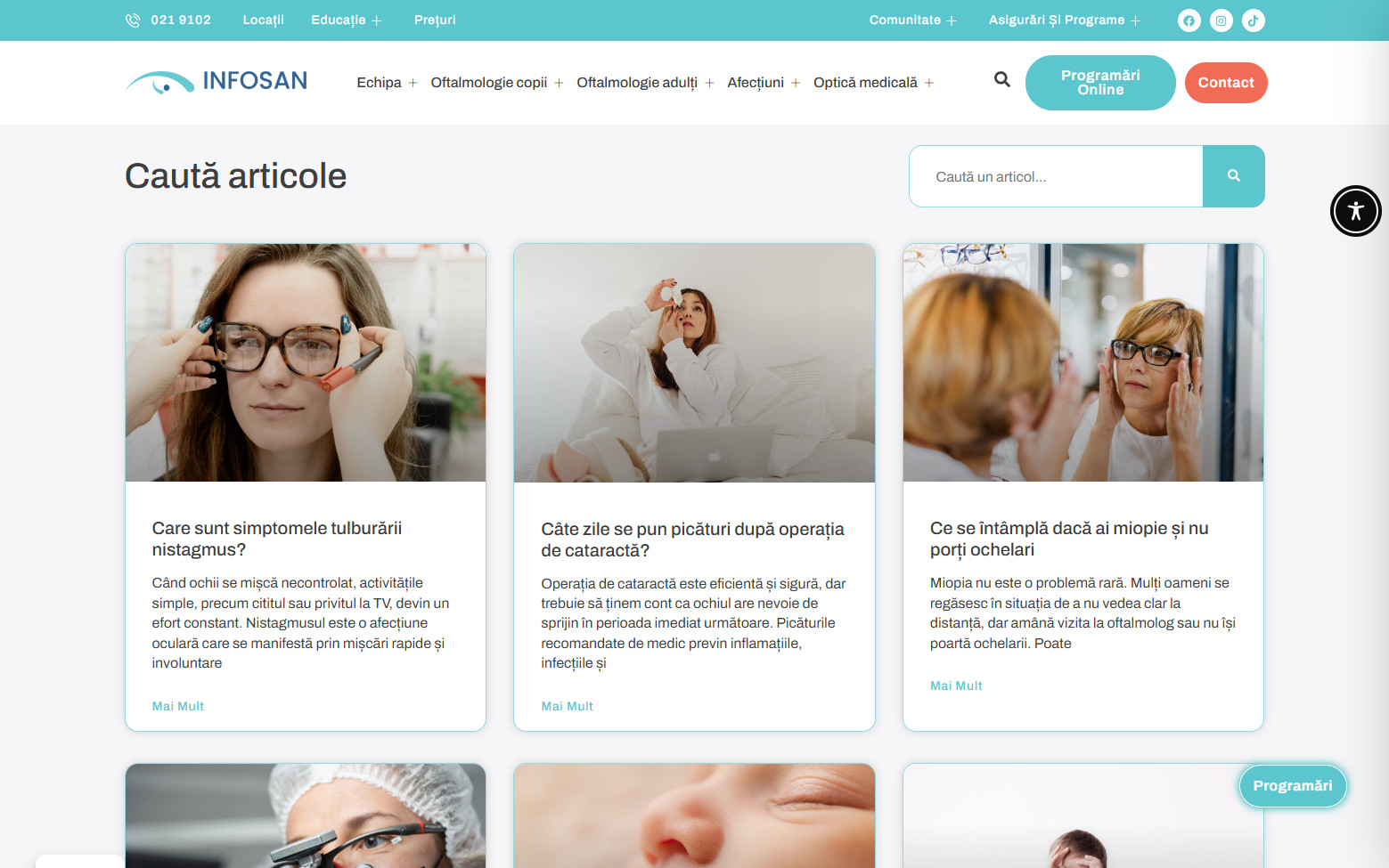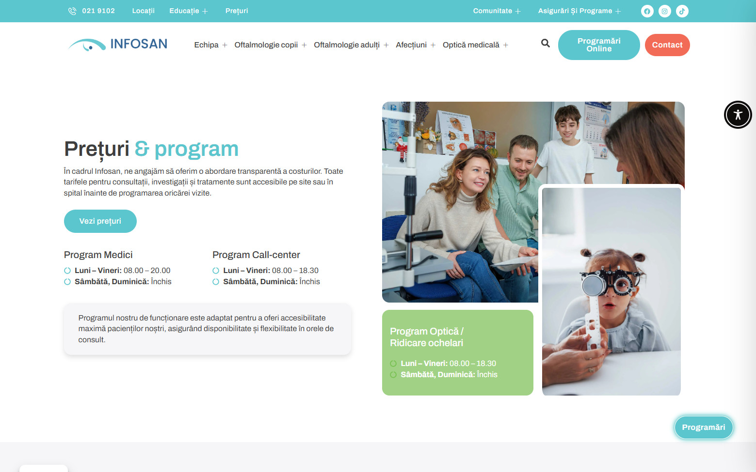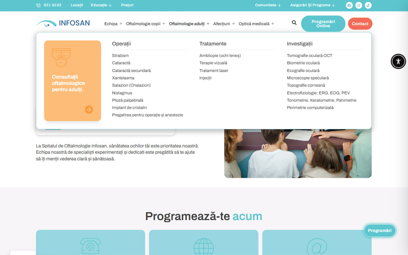 Vizitatorii site-ului sunt invitaţi să acceseze secţiunea „Programări online” sau să contacteze telefonic clinica pentru a beneficia rapid de consultaţii, investigaţii sau intervenţii în cele mai bune condiţii – astfel încât să obţină claritate vizuală şi suport de la o echipă dedicată.